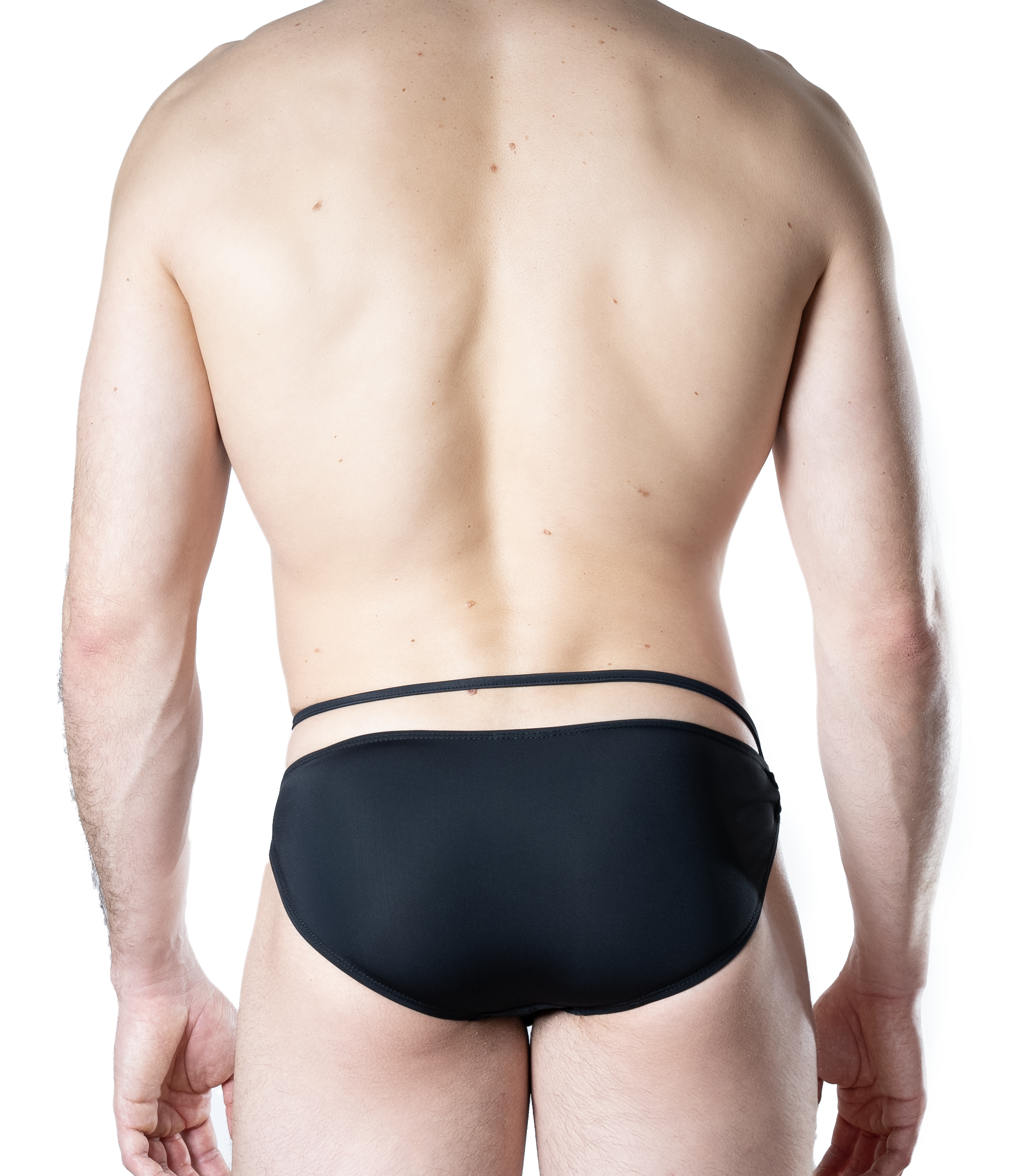 Low cut briefs with a lateral metal ring, waist string and metallic lettering.